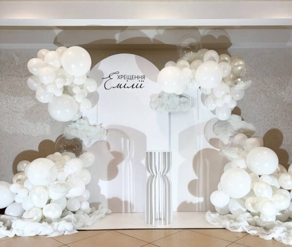 Delikatna ścianka dekoracyjna o wymiarach 3 × 2,2 m, idealna na chrzest, baby shower i rodzinne uroczystości. Biała girlanda balonowa z efektem chmur tworzy lekkie, jasne tło, które pięknie wygląda na zdjęciach. Minimalistyczna, uniwersalna i gotowa do efektu WOW.